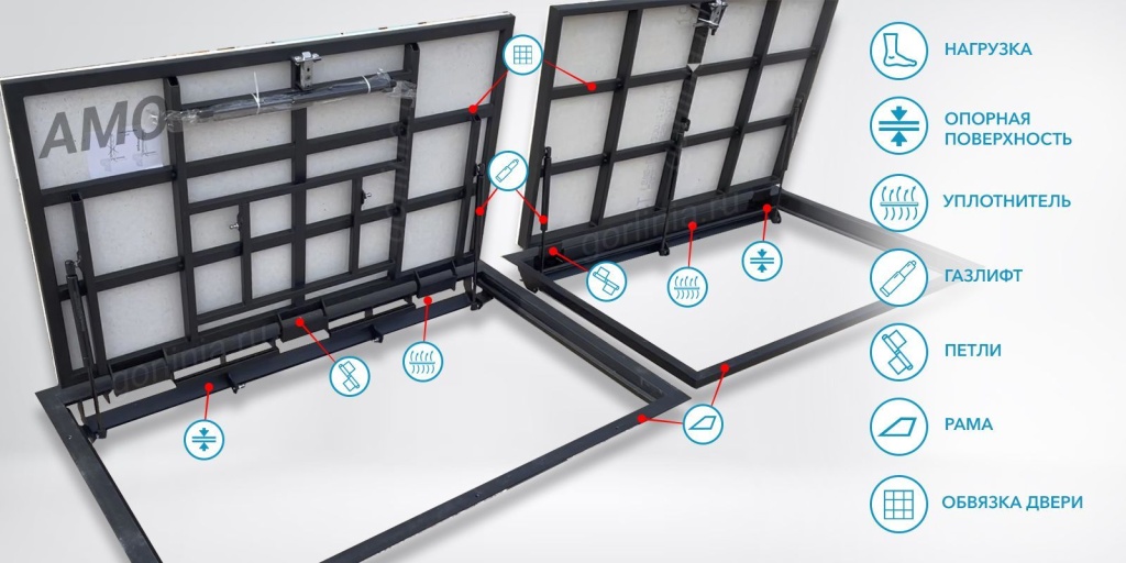- Флагманская модель АМО позволяет заводу-изготовителю закрыть все потребности покупателей, сварить раму и укомплектовать изделие элементами так, чтобы оно легло в напольное отверстие, а строители закрепили бы коробку в существующем проеме через специальные штатные крепления без доработок. Серия АМО незаменима для проходных мест в комнате и коридоре.