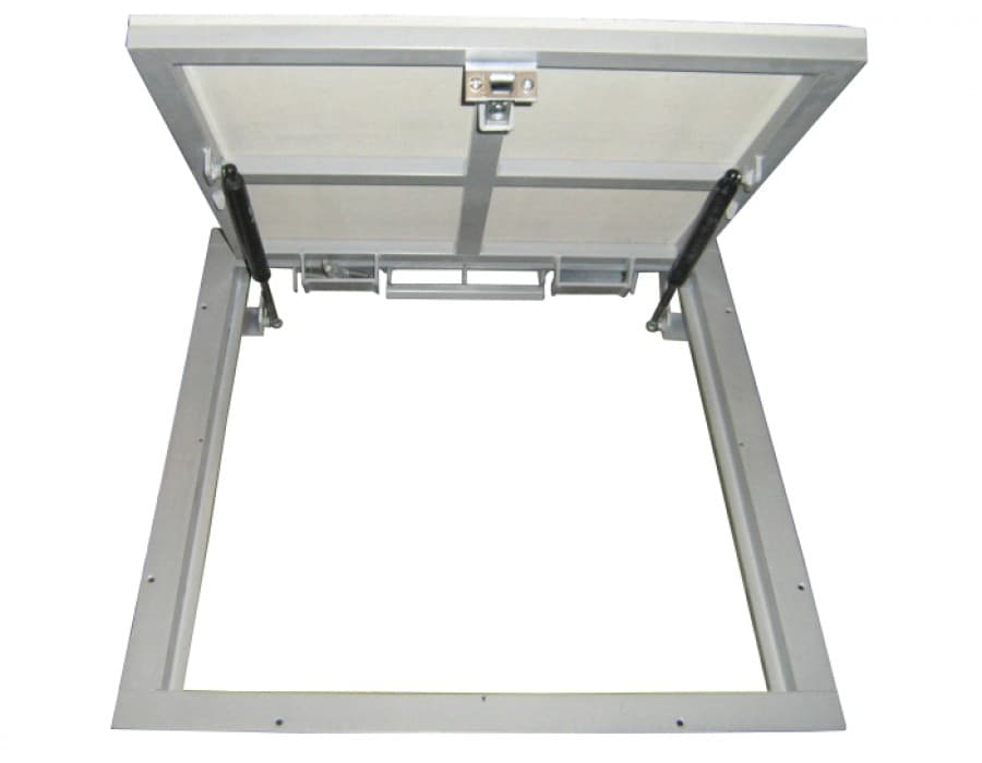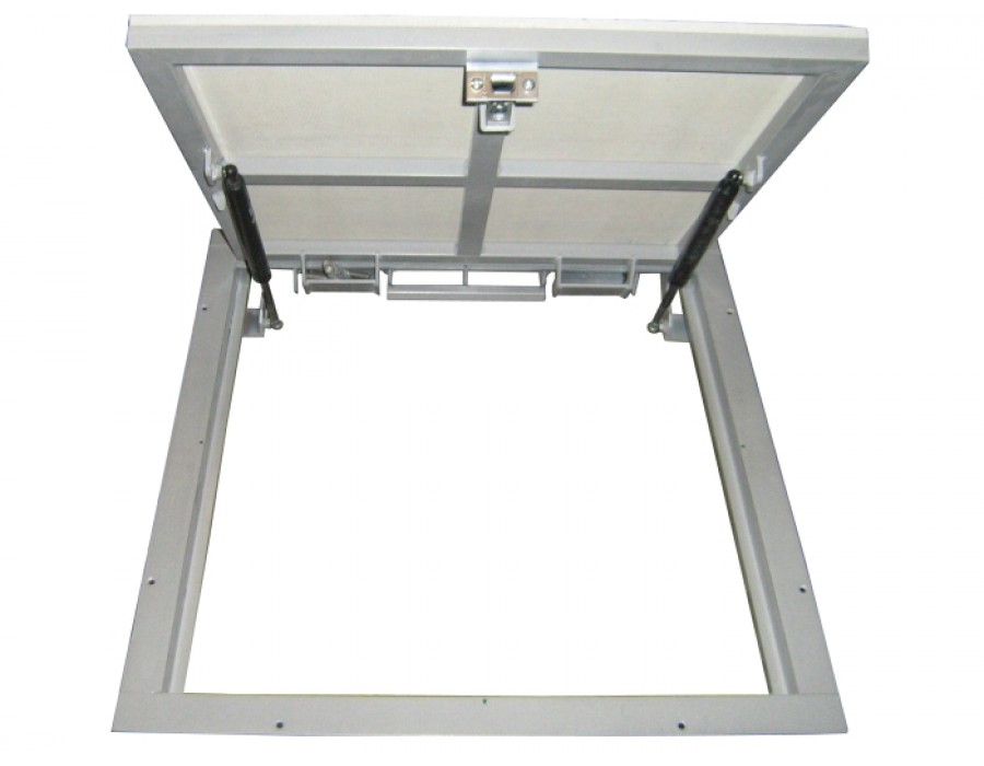 Потайные напольные люки АМО с амортизаторами выпускаются из стальной трубы сечения 30х20 мм и горячекатанного сортового уголка 40х40х4 мм. Окрашен в высокотемпературной камере порошковым покрытием. Предназначен для использования внутри помещений. Изделие оснащено амортизирующими подъемниками, внутренними петлями, замком с язычком и съемной ручкой. Тип открывания шарнирного механизма: откидной с одной осью вращения. Потайная крышка двери с гипсоволокном на металлокаркасе подготовлена под облицовку керамической плиткой (ламинированной доской). Толщина пирога (материал + клеевой слой) не более 15 мм.