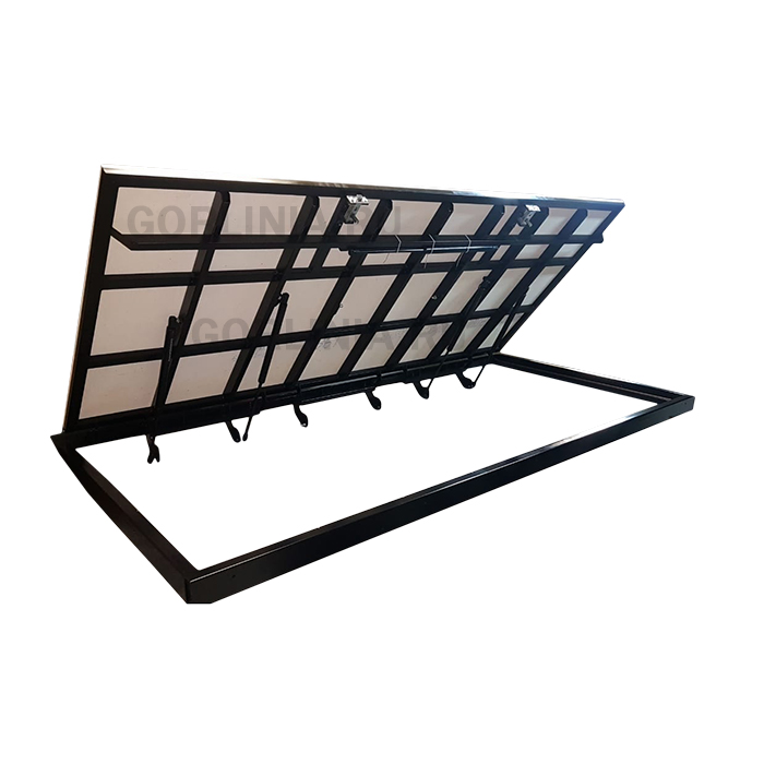 Большое количество пневмоподъемников в одной крышке на таком размере потребовало бы определенной физической подготовки хозяина, поэтому механизм оборудован ступенчатой загрузкой упоров: системой "кузнечиков". Возможно двухстворчатое исполнение, уточните при заказе.