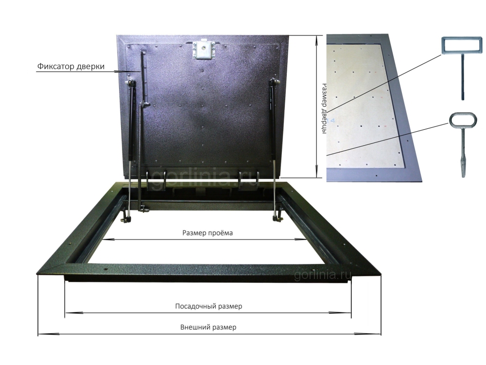 Каркас выполнен из уголка 50х50 мм. Установка производится методом погружения в напольный проем с наличником. Внешний габарит: 690х690 мм.
