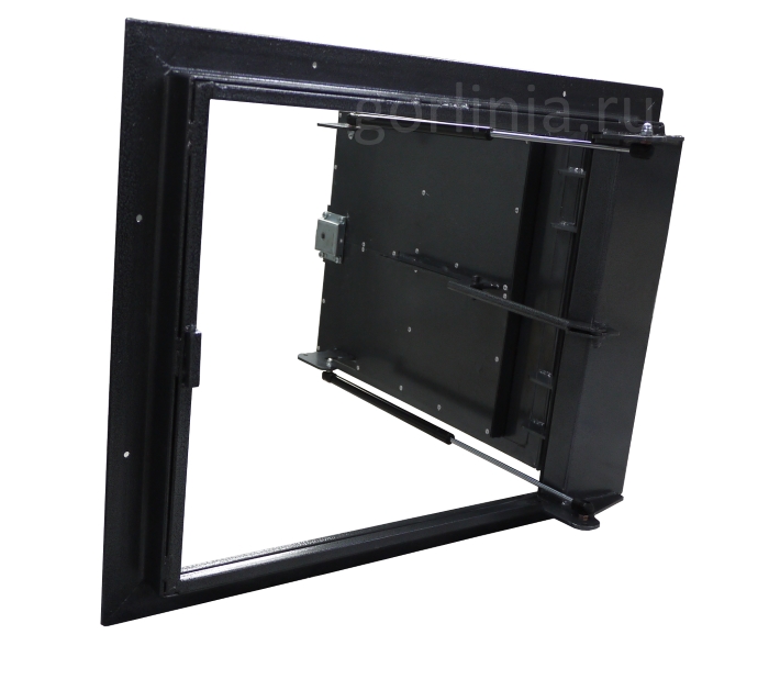 Створка в сэндвиче из листовой стали обшита плитой ГВЛВ в уровень с полкой наличника рамы, все элементы фурнитуры (замок, газлифты, шарниры) скрыты внутри: верхняя лицевая часть подготовлена под финишной отделку плиткой/ламинатом с отступами и зазорами по схеме завода-изготовителя.