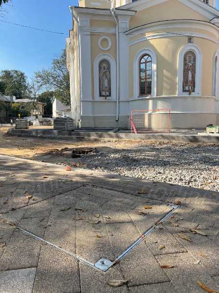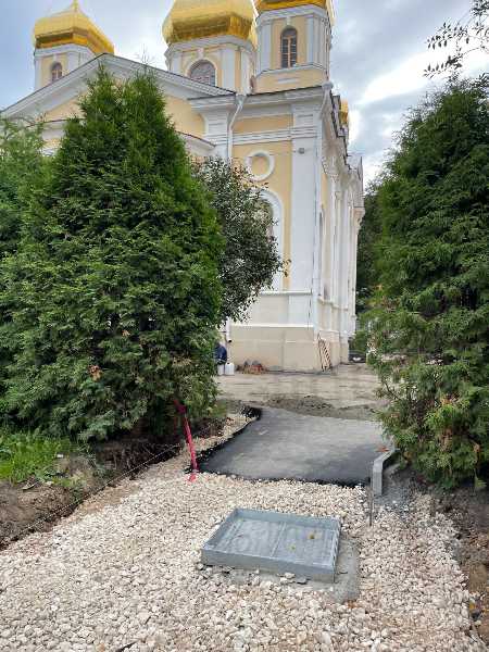 Отчет о применении оцинкованных скрытых люков Проспект-Ц 800х800*90 С250 в проекте благоустройства прилегающей территории Церкви Святителей Московских с устройством твердых покрытий тротуаров со смотровыми колодцами методом мощения бетонной вибропрессованной плиткой толщиной 60 мм.